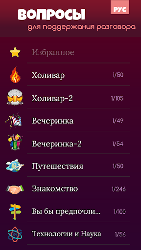 Вопросы и темы для поддержания разговора - название говорит само за себя. Есть тематики как для компании, так и для более личной беседы. Если в компании друзей вам станет скучно, вы всегда можете воспользоваться нашим приложением. Вопросы помогут узнать ваших друзей и знакомых с новой стороны.