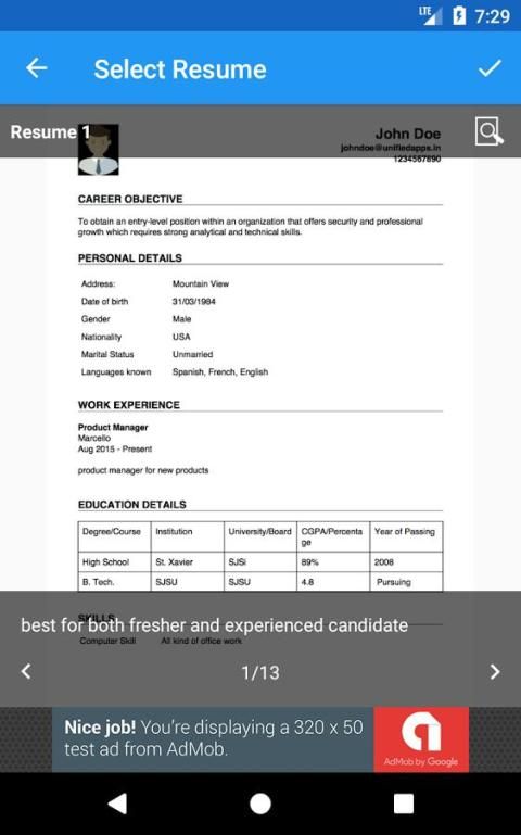 Вы можете сохранить все детали для дальнейшего использования, так что вы не должны ввести детали каждый раз. Вы также можете сохранить несколько профиля, если вы хотите, чтобы создать различные виды резюме или резюме для другого человека.