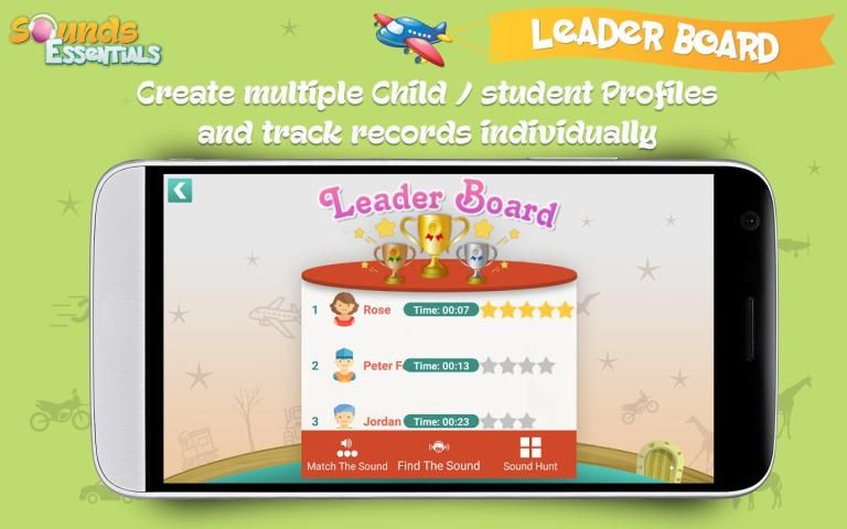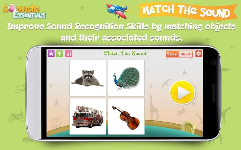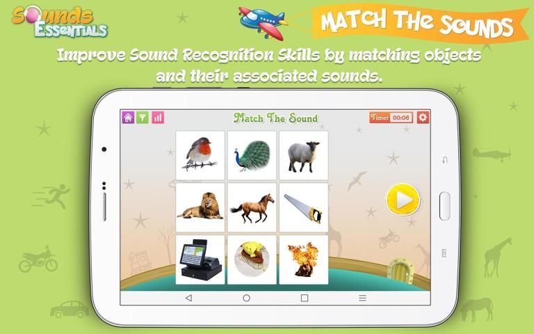 • Различные звуковые игры улучшают навыки путем сопоставления объектов и связанных с ними звуков.