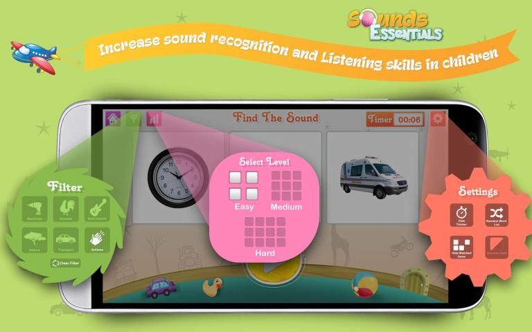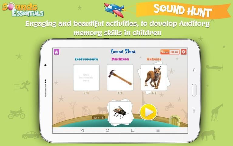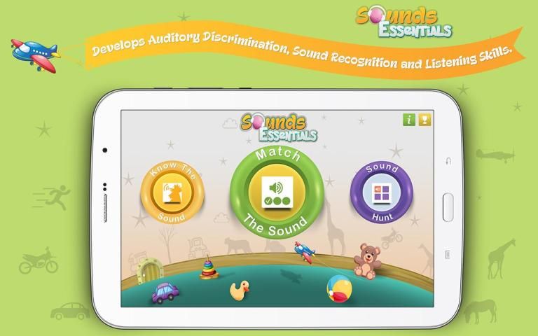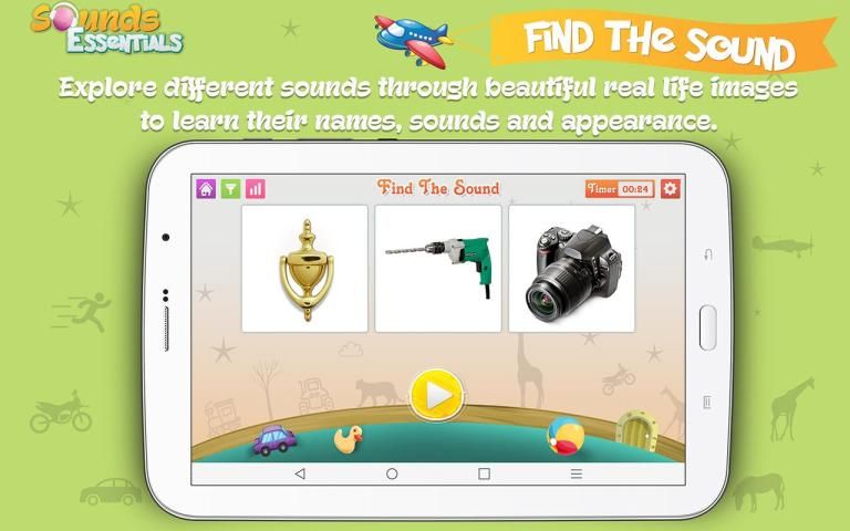 Звуки первой необходимости представляет собой идеальное сочетание образования с развлечением. Это приложение Edutainment может использоваться SLPs и речи терапии во время сеансов терапии, чтобы позволить детям построить слуховой памяти и распознавания навыков. Весело и привлекательный интерфейс приложения делает его приятным для малышей всего пути от детей дошкольного возраста в детский сад. Приложение имеет интересные мероприятия для детей, чтобы исследовать тысячи объектов, проводя влево или вправо, и слушать их звуки.