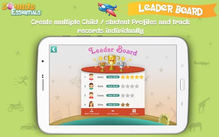 Звуки Основы позволяет молодым учащимся различать звуки различных объектов. Эта функция, которая обычно известна как «Слуховые дискриминации» помогает в создании звука или «слуховая память» среди студентов. Приложение имеет отдельные мероприятия для обеих функций позволяет лучше звук признание и аудирования. Дети, имеющие проблемы в секвенирования звуков, которые они слышат во время речевых сеансов терапии, таких как артикуляция и письма могут извлечь выгоду из содержания на основе Слуховых секвенирований в приложении.