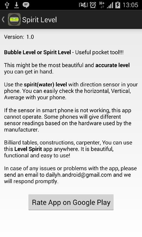 Дух Уровень Это красивый, функциональный и простой в использовании. Великий карман инструмент. Он использует акселерометр, чтобы помочь вам испытать наибольшее объект для его уровня или отвеса. Дух Уровень является точным и простым в использовании и невероятно полезный инструмент для вашего Android устройства.