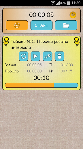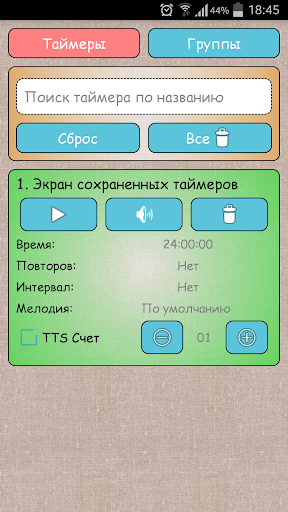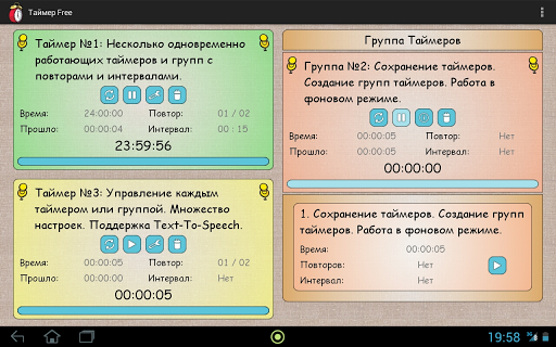 Нет времени или неудобно смотреть на экран устройства? Вам это не должно доставить проблем т.к. приложение поддерживает технологию синтеза речи "Текст в речь" (Text-To-Speech, TTS) **, а это значит, что вся необходимая информация о прошедшем времени будет озвучена. При помощи функции "TTS Счет" *** можно синтезировать последовательность чисел (1, 2, 3 и т.д.) через заданный интервал. Если у Вас нет возможности использовать технологию TTS, вы все равно не пропустите начало следующего повтора или таймера. Предупредительные фразы озвучены профессиональными дикторскими голосами. Таймер умеет работать в фоновом режиме, тем самым увеличивая время работы Вашего аккумулятора.