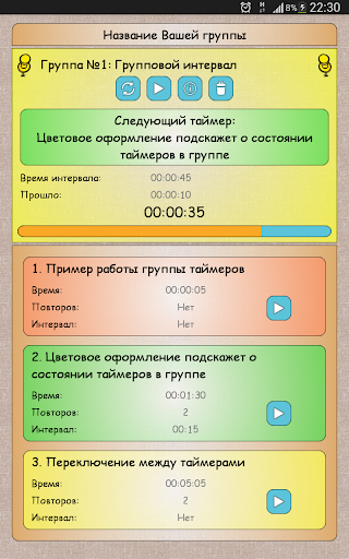 Приложение идеально подойдет для интервальных (HIIT) тренировок, для бега или любых других видов спорта. Таймер универсальный, поэтому его можно использовать, как на кухне для готовки любимых блюд, так и для подготовки к экзаменам или важной презентации. Кроме того, можно запускать несколько таймеров (или групп) одновременно, тем самым выполняя обратный отсчет для совершенно разных задач. Комбинируйте количество повторов, интервал между повторами и таймерами в группе, а так же множество других настроек для достижения желаемого результата.