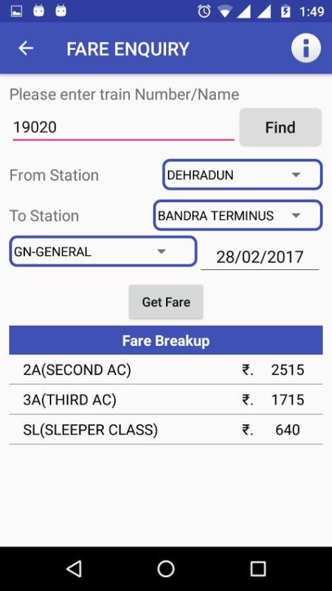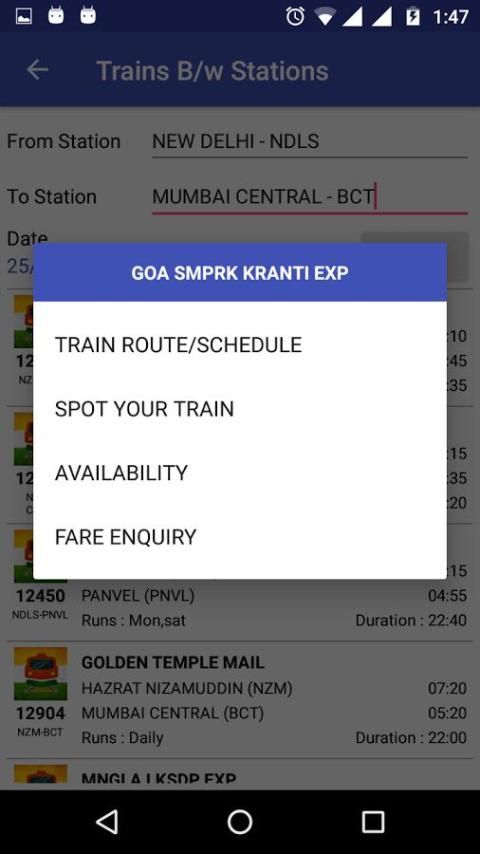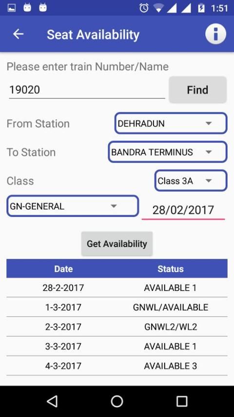 Просто введите номер поезда или название поезда или источник или пункт назначения или их комбинацию и получить всю достоверную информацию о поездах сроки и его расположение в секундах.