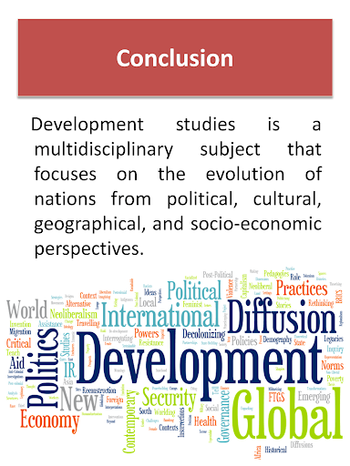 Development studies is an interdisciplinary branch of social science. Development studies is offered as a specialized master's degree in a number of reputed universities across the world, and, less commonly, as an undergraduate degree.