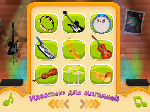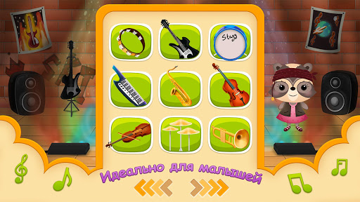 Знакомство с музыкальными инструментами. Специально для вашего малыша Кенди Енот сыграет на бубне, саксофоне, электрогитаре, барабанной установке, трубе, скрипке, саксофоне, тарелках, синтезаторе. Даже младенцы нажав на инструменты,