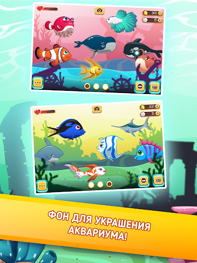 • Изменяйте фон аквариума, выбирайте старые и редкие развалины, загадочные обломки затонувших кораблей, спокойный голубой океан или уникальные зеленый и розовый океаны!