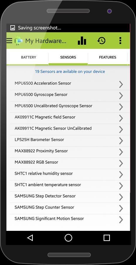 5. Сенсоры: Количество и тип датчиков варьируется устройства к устройству, он обнаруживает все список датчиков с их живыми изменяющимися значениями.