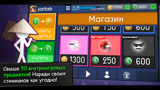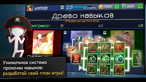 Изучайте навыки во время игры, зарабатывая очки урона. Прокачав отдельную ветку до конца вы получите ультимативное оружие, что может оказаться смертельным для противника при грамотном использовании! Познав особенности игры, можно вытворять невероятные вещи, переворачивая исход битвы за 1 ход. Всё это и многое другое ждёт вас в Epic Stickmans Fights, до встречи на поле боя!