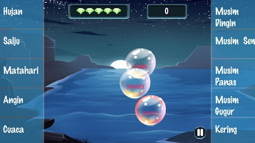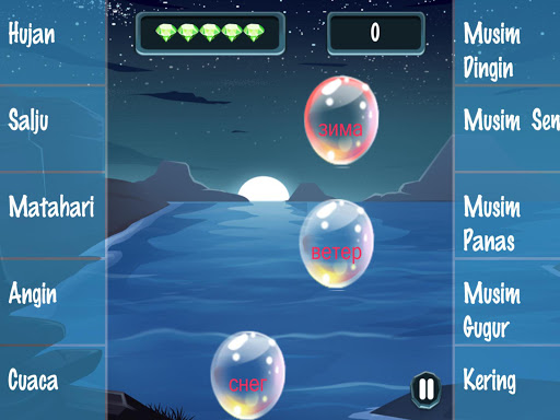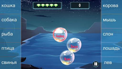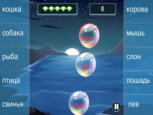 Эта весёлая и занимательная игра научит вас слушать и читать слова и выражения на индонезийском языке. Каждое слово плывёт в пузырьке, на который вы должны нажать и лопнуть его, выбрав кнопку с соответствующим переводом.