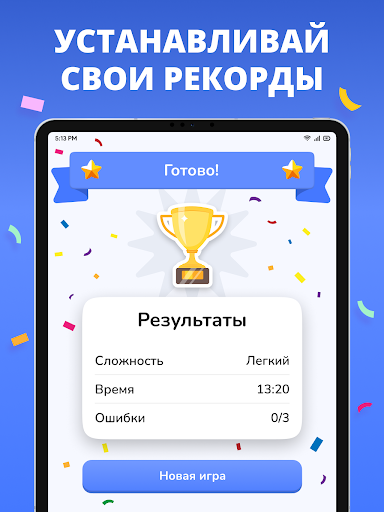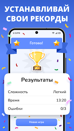Используйте подсказки, если вам нужна помощь - станьте настоящим мастером разгадывания судоку. Устанавливайте новые рекорды, соревнуйтесь с друзьями, сравнивайте время и количество ошибок. Станьте лучшим!