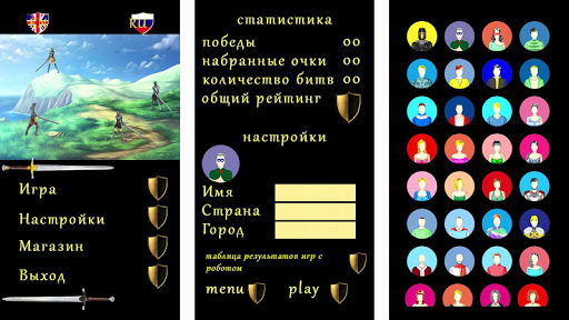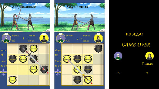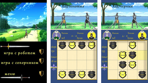 Мы создали эту игру с нуля. Сами придумали правила и, на наш взгляд, получилось интересно. Добавили сражающихся рыцарей и теперь, передвигая шашки, Вы можете можете управлять движениями рыцарей, устраивать битвы с друзьями, случайными соперниками, с роботом Брианом де Буальгибером из Петербурга, а так же играть на одном экране без интернета . Это мини игра, сеанс игры длится 10-15 минут.