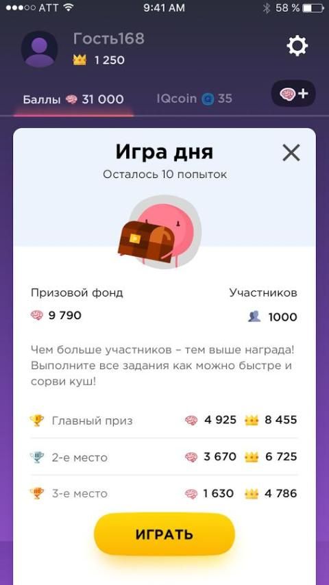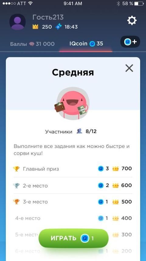 - этот режим подойдет любителям массовых игр. Вам пригодится этот тренируй память тренажер мозга для успешного прохождения сложных уровней. Вы все так же должны проходить тесты на логику внимание и память на время. Такая тренировка мозга математика позволит вам быстро решать задачки и в реальной жизни. Выигрыш из общего банка игры на ум и логику распределяются следующим образом: 1, 2 и 3 место получают выигрыш пропорционально месту. Эта борьба умов игра заставит вас выложиться по полной.