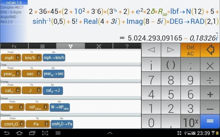 THIS IS → rvCALC !! ▪ An application that can be used as a Scientific Calculator and also as a Standard and Simple Calculator ▪ A fully featured Scientific Calculator with a lot of Functions, Math & Physics Constants, Complex Numbers, Auto-Correction Features and a complete set of Unit Conversions ▪ INTUITIVE and very EASY TO USE, even in Scientific Mode ▪ A must have for highschool, university and at work !! ❶ STANDARD and SCIENTIFIC modes This calculator has two modes of operations with an ergonomic design: ▪ STANDARD: Vertical orientation ▪ SCIENTIFIC: Horizontal orientation To change from Standard to Scientific and from Scientific to Standard you just need to rotate your screen. ❷ COMPREHENSIVE SCIENTIFIC FUNCTIONS This calculator has a broad and comprehensive set of scientific functions that differentiate it from any other in the market: ▪ Complex & Real Numbers ▪ Math Functions: +50 ▪ Math & Physics Constants: 30 ▪ Unit Conversion: 200 units in 13 groups ▪ Configurable Options ❸ INNOVATIVE FEATURES Includes new and very useful Auto-Correction Features that are automatically available in real time "As you Type": ▪ Automatic Error Detection and Visualization ▪ Automatic Error Correction ▪ Automatic Parenthesis Evaluation ▪ Automatic Exponential Functions Evaluation ▪ Automatic Operators ❹ FORMULA HISTORY Formula History allow you to review, modify and/or re-use your work ❺ INFORMATION & MANUAL ▪ https://sites.google.com/site/rvcalc2013/ ▪ Very complete and clear manual ▪ General Description ▪ How to Use ▪ Functions ▪ Constants ▪ Unit Conversion ▪ Options ❻ OPTIONS ▪ Real and Complex numbers (Paid version) ▪ Engeneering, Scientific and Fix numbers ▪ Complex Numbers in Rectangular and Polar notation (Paid version) ▪ Number of Digits: 4 to 16 ▪ Angle Units: RAD, DEG, GRA ❼ MATH FUNCTIONS (50 functions) ▪ General Functions ▪ Exponential & Logaritmic ▪ Trigonometric ▪ Trigonometric - Additional (Paid version) ▪ Hyperbolic ▪ Hyperbolic - Additional (Paid version) ▪ Statistics (Paid version) ▪ Complex Numbers (Paid version) ❽ UNIT CONVERTION FUNCTIONS (200 units) ▪ Angle ▪ Temperature ▪ Distance / Length ▪ Astronomical Distance (Paid version) ▪ Area ▪ Volume ▪ Force (Paid version) ▪ Mass (Paid version) ▪ Speed ▪ Time (Paid version) ▪ Energy (Paid version) ▪ Power (Paid version) ▪ Pressure (Paid version) ❾ MOBILE PHONES and TABLETS Available for Android Phones & Tablets ⑩ WISH LIST Post feature request into the following site: ▪ https://sites.google.com/site/rvcalc2013/ ⑪ ERROR REPORT Send error reports to the developer via email: ▪ prbSwDev@gmail.com (subject: ERROR - xxx)