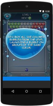 El objetivo del juego es limpiar de burbujas el rectángulo de juego evitando que estas rebasen la línea del fondo que marca el fin de la partida. Cada burbuja es disparada automáticamente tras un cierto tiempo si el jugador permanece inactivo. Tras limpiar la zona de juego, la siguiente fase comienza con un nuevo patrón de burbujas a eliminar.