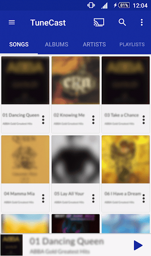 TuneCast supports just about any type of mp3, midi, wav, flac, raw, aac files and other audio formats. Easily browse songs by genre, album, artist, song name and folder and play on your phone or to your TV.