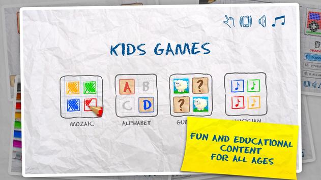 kids games, which can not only give parents an extra hour of personal time, but also can help kid to develop it’s logical thinking, creative musical and artistic skills.In the game “mosaic” child is offered to build a picture according to sample from mosaics of different colour. While building pictures, child has fun in the process and memorizes basic colours of rainbow. At any time you can use “help” button, which will prompt where you need to put a necessary colour. The game “alphabet” helps to learn letters and figures with fun.
