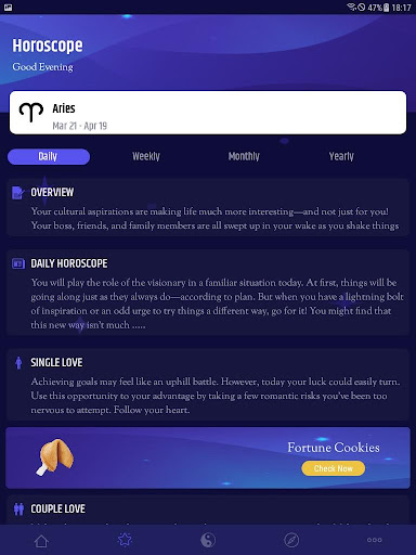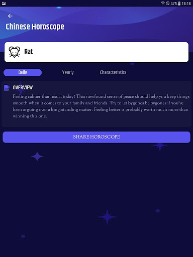 Ang Araw-araw na Horoscope Pro app ay isang hula lamang ng iyong pang-araw-araw na buhay batay sa ilang mga kadahilanan tulad ng petsa ng iyong kapanganakan, oras, atbp. Ipinapakita nito araw-araw, pati na rin ang lingguhan, buwanan at taunang impormasyon na may kaugnayan sa iyong sun-sign. Tulad ng araw-araw na horoscope pro app ay user friendly maaari mong ibahagi ang iyong pang-araw-araw na horoscope sa iyong mga kaibigan sa Facebook sa pamamagitan ng araw-araw na horoscope pro app.