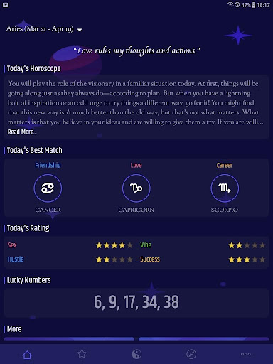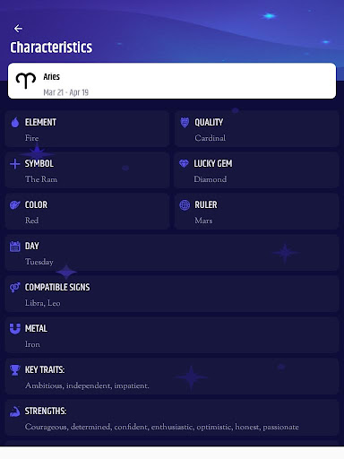 Araw ng Lucky, Affirmation, Araw-araw na Horoscope, Lingguhang Horoscope, Buwanang Horoscope at Taunang Horoscope kasama ang pagiging tugma at mga katangian.