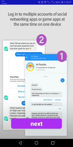 Dual Space is an app that provides a natural & separate virtual environment for Android users to clone and run multiple accounts of the same app simultaneously on one device, and also enables users to create their customized space.