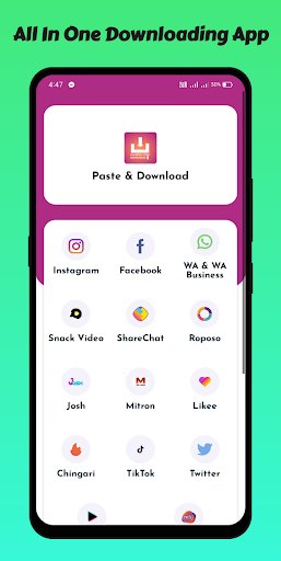 I-download ang anumang mga social na video / larawan mula sa Instagram, Whatsapp, Facebook, Josh, Snack video, ShareChat, Ropso, Mitron, Likee , Chingari, Tik Tok, Twitter, Moj atbp ... Sa HD Marka at Copyight Libreng Mga Video / Mga Larawan nang walang watermark na may tulong ng "I-paste & I-download"