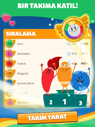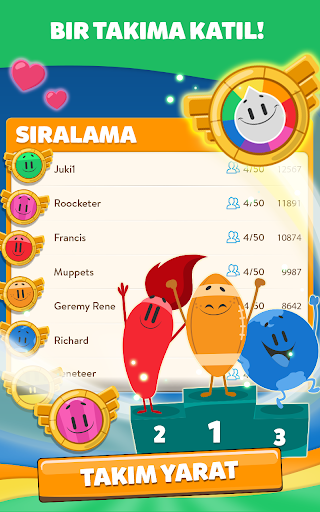 Bu zeka testinde yalnız değilsin. Takımların en fazla 50 üyesi olabilir. Kendi takımını da oluşturabilirsin! Neye yarar? Diğer üyelere can gönderebilir veya onlardan can isteyebilirsin, ayrıca diğer takımlara karşı birlikte Kule Düellosu oynayabilirsiniz!