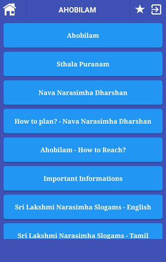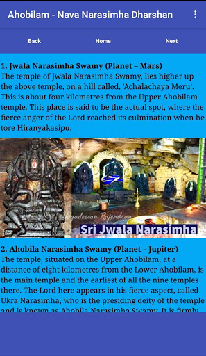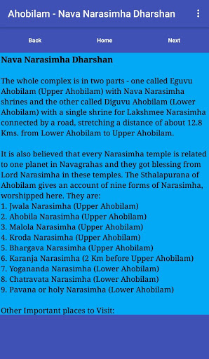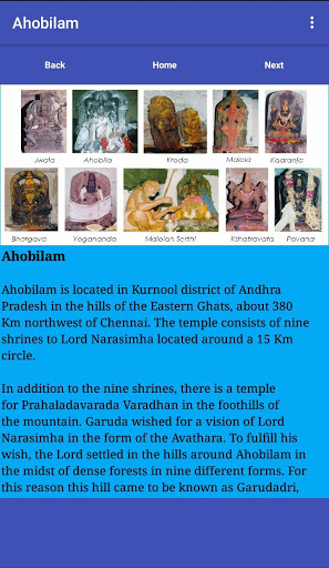 "Ahobilam - Sri Nava Narasimha Swamy Temple" App will be useful for Ahobilam dharshan. This app will be a guide for first time visiting devotees. Also, lot of useful information like Sri Lakshmi Narasimhar Slogams and Mangalasasanam songs to prayer for all devotees.