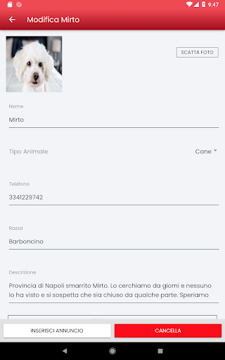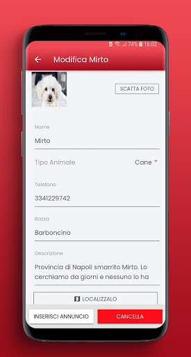 • Mất động vật nếu bạn bị mất thú cưng và muốn chèn mô tả của mình (ảnh, chủng tộc, tên, v.v.)