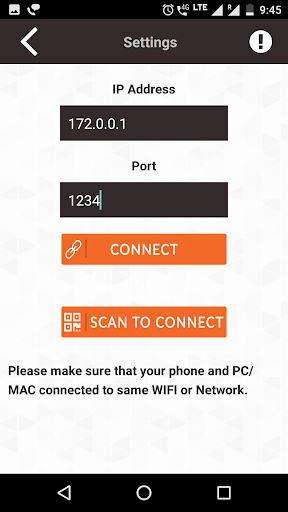 Screen for the setting of IP port and adress with option to scanning QR code to connect SCC Remote control with the same WIFI as our desktop Showfit Class Creator - SCC.