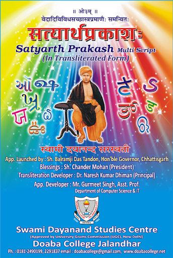 This is book (Satyarth Parkash) Written By Swami Dayanand Saraswati which is converted to Digital Format By Dr. Naresh Kumar Dhiman. This app is Searchable Text Format so that every one can research on the Satyarth Parkash easily. This concept of digitization of the Satyarth Parkash is proposed by Dr. Naresh Kumar Dhiman. This app Developed Under the Guidance of Dr. Naresh Kumar Dhiman (Principal) Doaba College, Jalandhar. This Concept Developed By Prof. Pardeep Bhandari (Head) P.G. Dept. of Computer Science & I.T. Android App Developed By Asst. Prof. Gurmeet Singh P.G. Dept. of Computer Science & I.T. Database of the Satyarth Parkash Provided By Swami Dayanand Study Center. All Rights of this App is Reserved By Doaba College, Jalandhar.