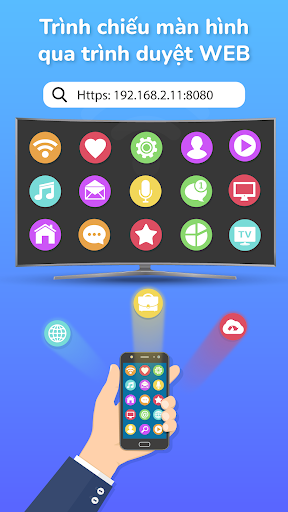 🔥Ngoài ra ứng dụng còn hỗ trợ tính năng trình chiếu màn hình thông qua trình duyệt Web. Bạn chỉ cần lựa chọn nội dung hình ảnh, video hay bất cứ điều gì bạn muốn và bấm nút “Trình chiếu” và giờ đây bạn có thể sử dụng trình duyệt web truy cập vào địa chỉ đã được cài đặt sẵn từ ứng dụng để thưởng thức những nội dung phản chiếu hấp dẫn từ điện thoại.