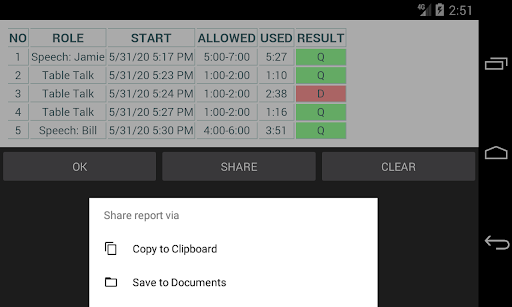 - Handy timing report, with auto-reset between meetings, that can be shared via Clipboard, folder, or other apps.