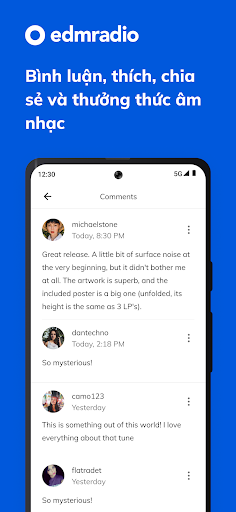 Ứng dụng của chúng tôi luôn cập nhật các luồng mới của các DJ, Nhà sản xuất âm thanh và đài Radio khác nhau. Bạn có thể nhanh chóng đăng nhận xét của mình về bài hát hoặc trộn và trò chuyện với những người nghe khác về bài hát đó hoặc thậm chí trò chuyện với chủ sở hữu luồng.