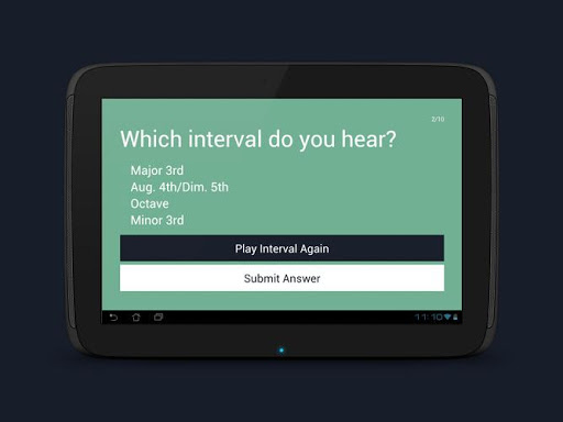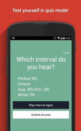 -Quiz Mode: Test your knowledge! The multiple choice quiz mode plays an interval for the user to identify from a list of four options. The comprehensive quiz mode has all of the qualities and numbers to choose the correct answer from, based on the difficulty chosen.
