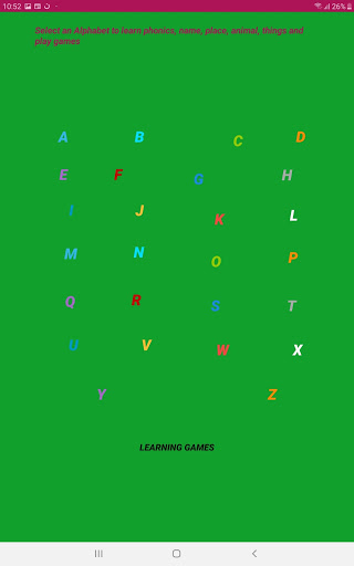 • ABC phonics names places animals things and games section Read, Play and learn. Extremely easy to learn for children. Human voice for Alphabets