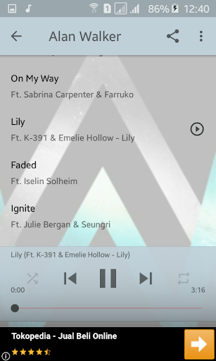 Aplikasi khusus lagu-lagu Alan Walker lengkap secara offline sehingga tidak perlu menggunakan kouta internet agar menghemat kouta internet anda