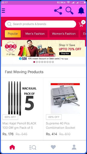 Online Shopping App where you can shop from a variety of online portals Instantly use more top Indian shopping sites, Checkout Daily Deals and Handpicked Deals & Offers from top Shopping Sites with new All in One Shopping app. Receive easily app notifications on Live Offers & Discounts and notifications of all Sales on a daily basis.