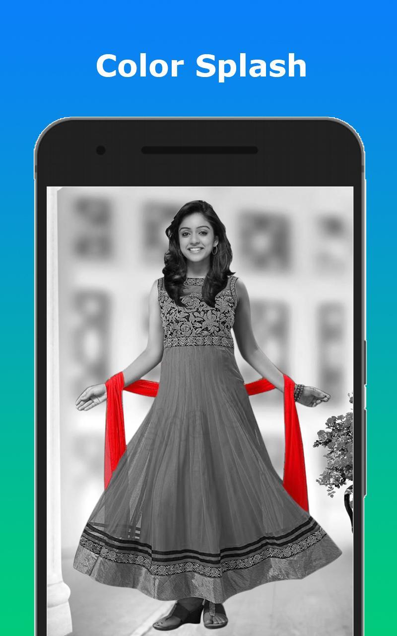 The other features of this Anarkali Dress Photo Suit are Echo mirror effect, Blur photo, Color Splash, Blur Background, Photo Collage, Blend photo effect for photo & stickers, lock and unlock feature for backgrounds and stickers.