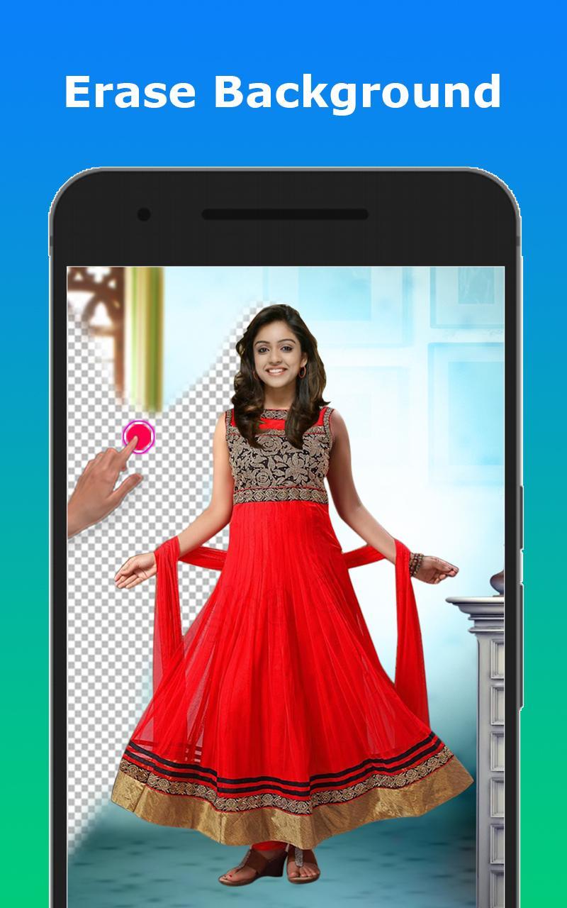 You can use Anarkali Dress Photo Suit Background eraser option to erase unwanted background from your existing and new photos & selfies. There are two types of erasers available in this app. One is auto eraser and the other is manual eraser. In manual eraser, eraser size can be adjusted. Either decreased or increased.
