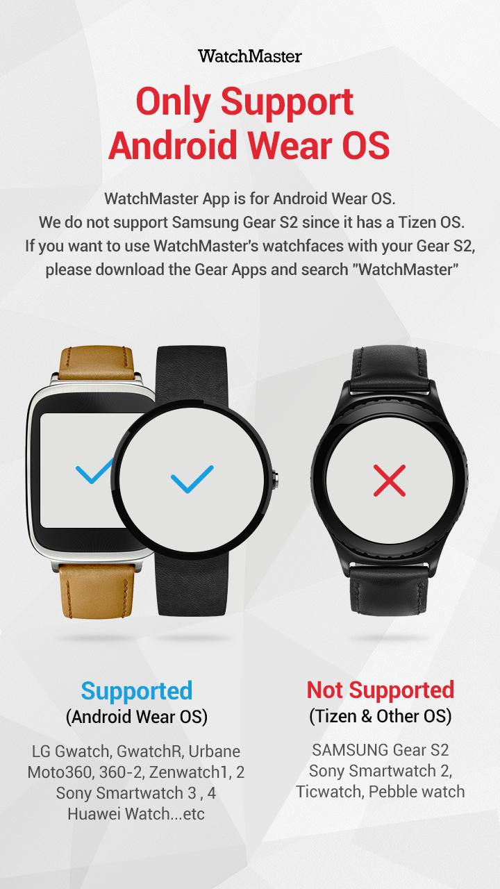 For the Samsung Gear S2 users, please search "WatchMaster" in the Gear apps then you will see the WatchMaster's individual watchfaces. We do not have WatchMaster app for the Tizen right now. We're sorry for the inconvenience.