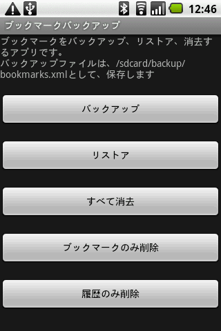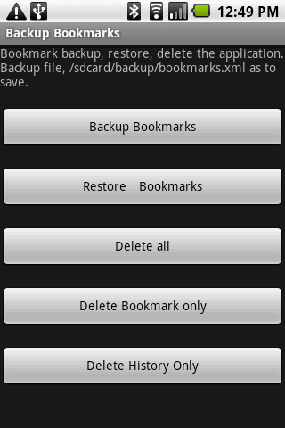 bookmark backup restore, delete the application Backup file, sdcardbackupbookmarks.xml as to save.