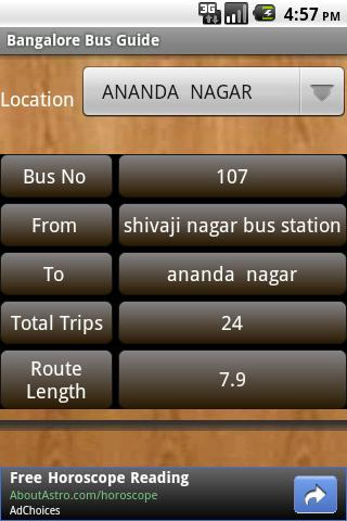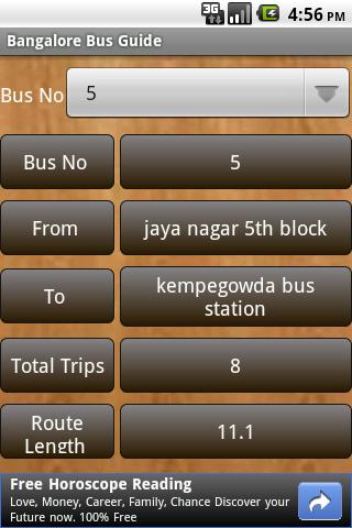 This Application is useful to find out the buses in the Bangalore city. We can search the buses information by using source and destination,by bus numbers and by location also.This Application can also give information about route length and number of trips in that route.No need to have Network connection for trip planning or bus route search.In thisversion we provided withcity centered buses information and suburban buses information includingVajra, Vayu Vajra and Big10 route services.More features also will be added in the coming versions.DISCLAIMER:The content provided in this are not belongs to us.This application is not affiliated with BMTC.