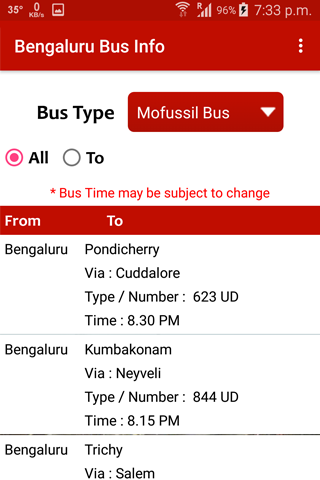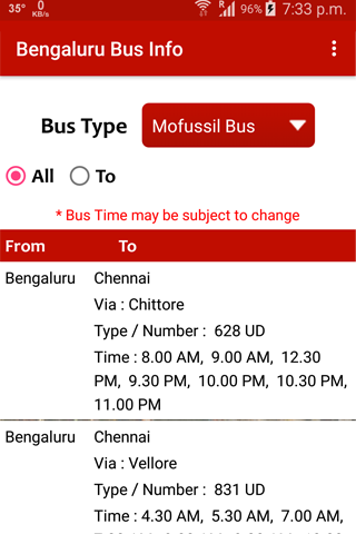 This app provide all information about Bangalore Mofussil bus and Town bus.