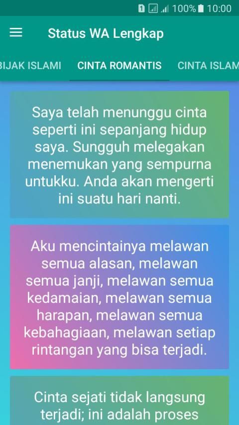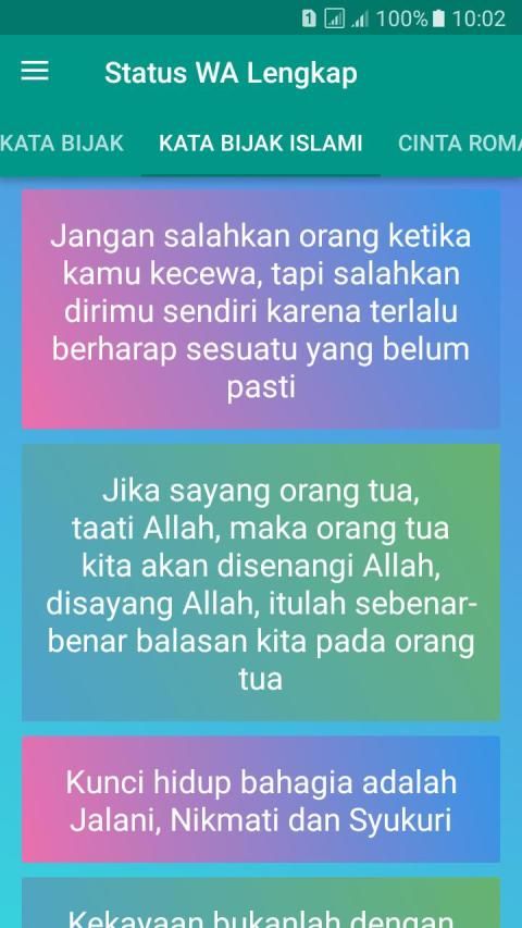 Status wa kata kata mutiara, status romantis, bijak, sedih, rindu, islami dan masih banyak lagi. Semua ada dalam aplikasi ini. Aplikasi ini memiliki lebih dari 10 kategori status whatsapp yang bisa kamu pilih dan kamu share ke teman-temanmu.
