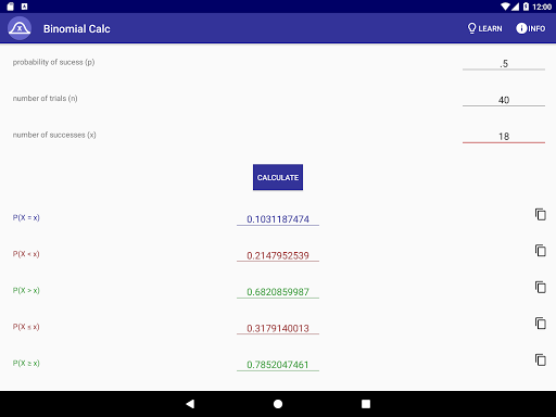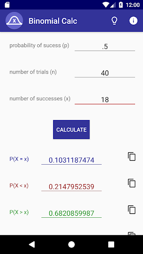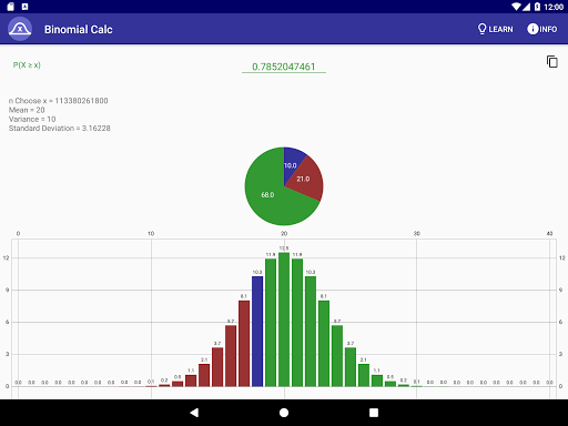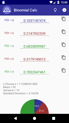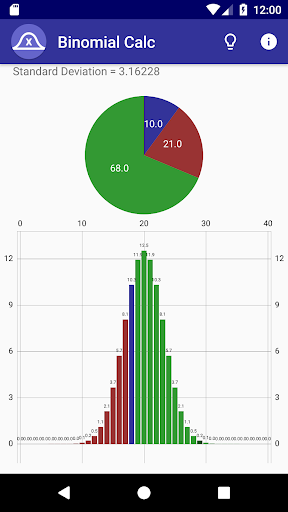 This app lets you easily calculate binomial distributions and probabilities. Just enter the probability of the event, the number of trials, and successes, and you can see the odds of that many successes, as well as the odds of more, or less than that many. You can also view the mean, variance, and standard deviation of the distribution, and you can see beautiful graphs displaying the distribution as a bar graph and the odds of going above, below, or exactly equal to the number of successes you provided in a pie chart.