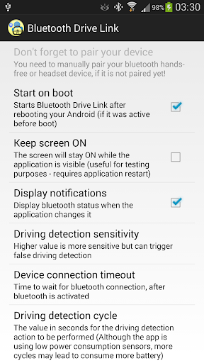 After that period, if you liked the application and its functionality, please install the final application available at Google Play store (https://play.google.com/store/apps/details?id=com.ferfig.bluetoothdrivelink).