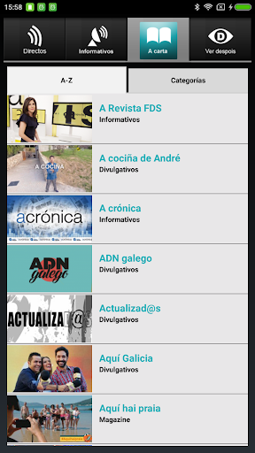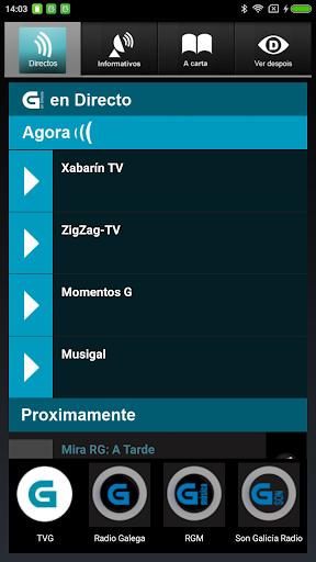 With CRTVG Informativos y Directos you can access CRTVG and the three broadcasts of Radio Galega (Radio Galega, Radio Galega Música and Son Galicia Radio).