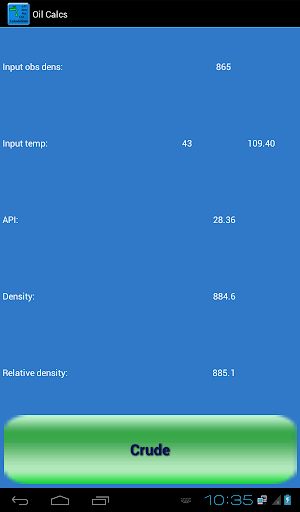 The app can calculate for crude oil, black and white products and lubrication oils, and input can be changed between density in vacuum / API, M3 and Barrels, and degrees Celsius / Fahrenheit.