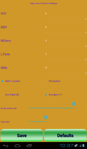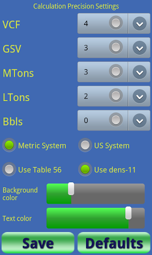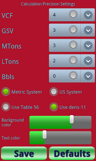 Precision for VCF, GSV, MTons, LTons and Bbls can be changed using a settings screen. Settings are saved in the app so that when you use the app next time it will calculate with your chosen settings.